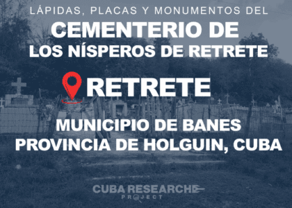Databases UncategorizedDatabase from Retrete Cemetery in Holguin Province Apr 28, 2025 crp5 Comments on Database from Retrete Cemetery in Holguin Province Database of those buried in the cemetery of Retrete, a rural town in the Province Share this on: