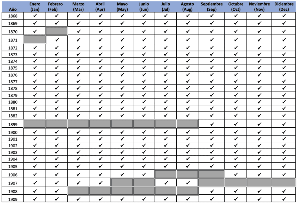 Las entradas de esta base de datos provienen del “Diario de la Marina”, el periódico de más duración en Cuba. La información de esta base de datos abarca los años 1868 a 1960 (¡casi cien años!). (ver a continuación los años y meses exactos revisados por la Sra. Reyes)